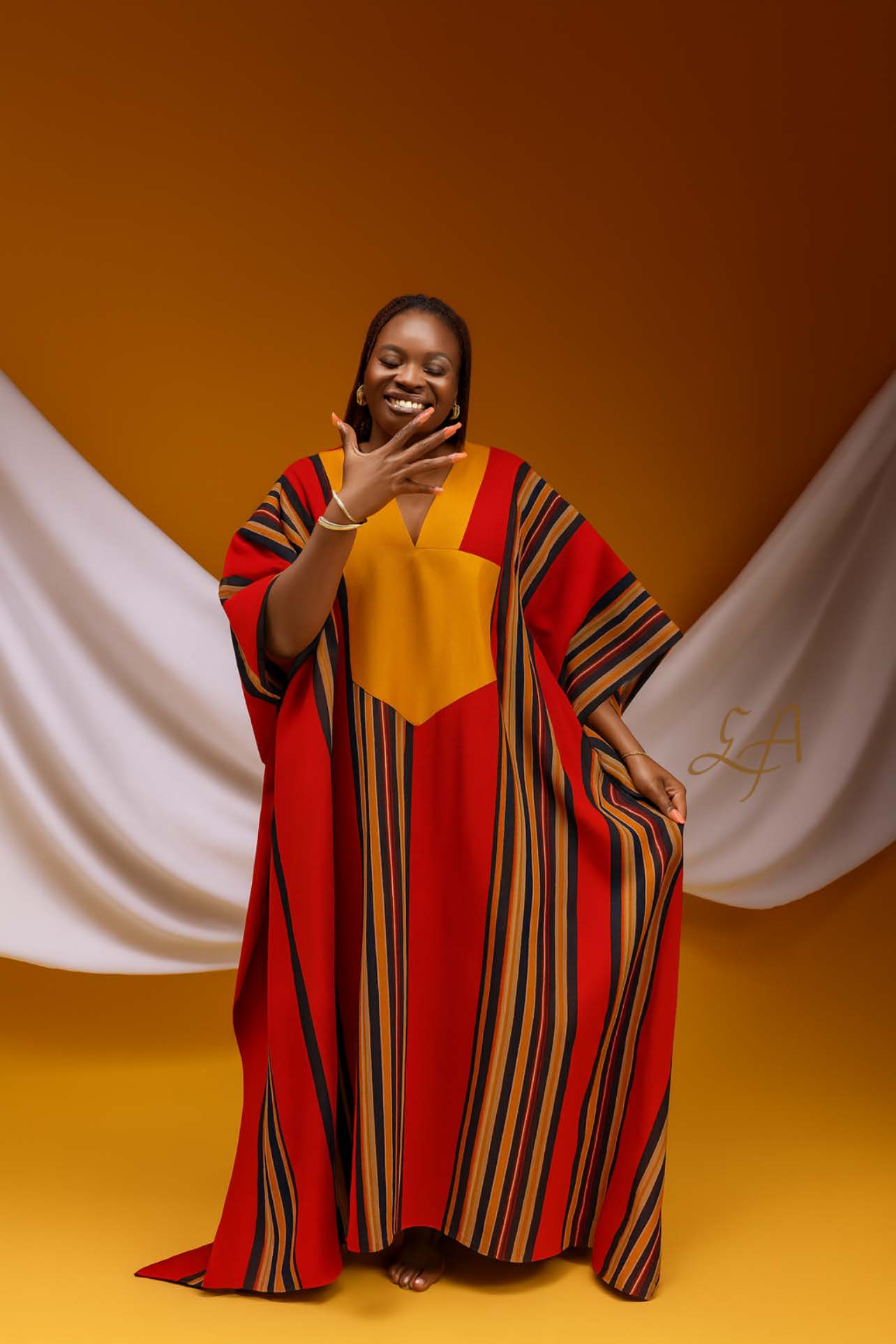 This isn’t just a kaftan. It’s Ijoba Royale—stitched for those who lead with presence. A bold red canvas, commanding stripes, and a golden V-panel that speaks legacy. Wide sleeves, flowing fit
