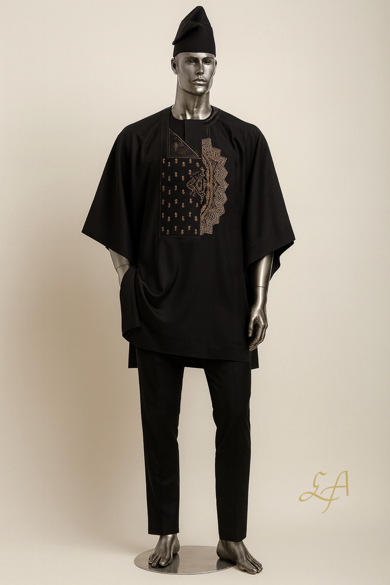 Design: Black 2-piece Agbada with intricate gold embroidery — geometric and symbolic motifs that honour tradition and elevate presence. Includes: trousers, wide-sleeved Agbada, and a matching fila cap.